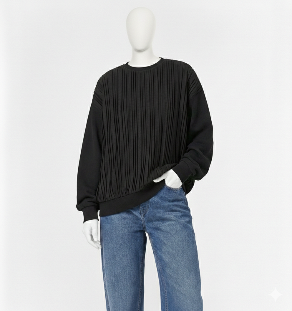The Élan sweatshirt features indifferent pleats, offering a unique blend of style and comfort for everyday wear. Its unisex design ensures versatility, while the floxy fabric enhances breathability. This garment is suitable for various body types, making it a practical choice for daily use.