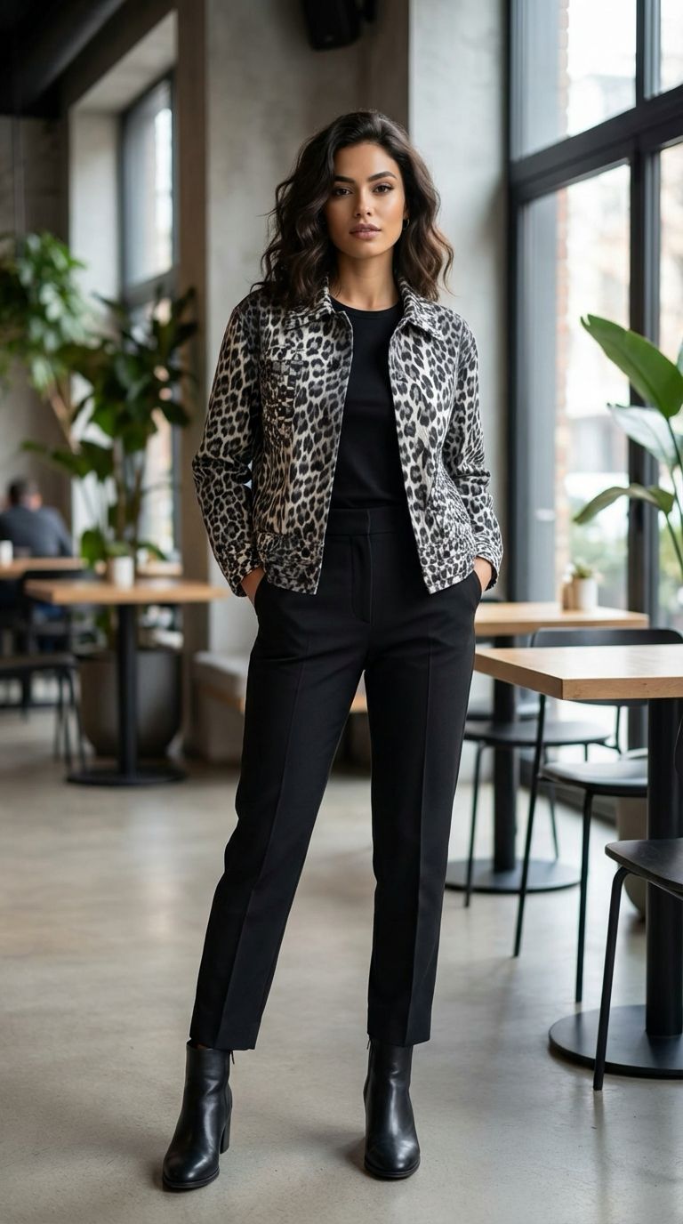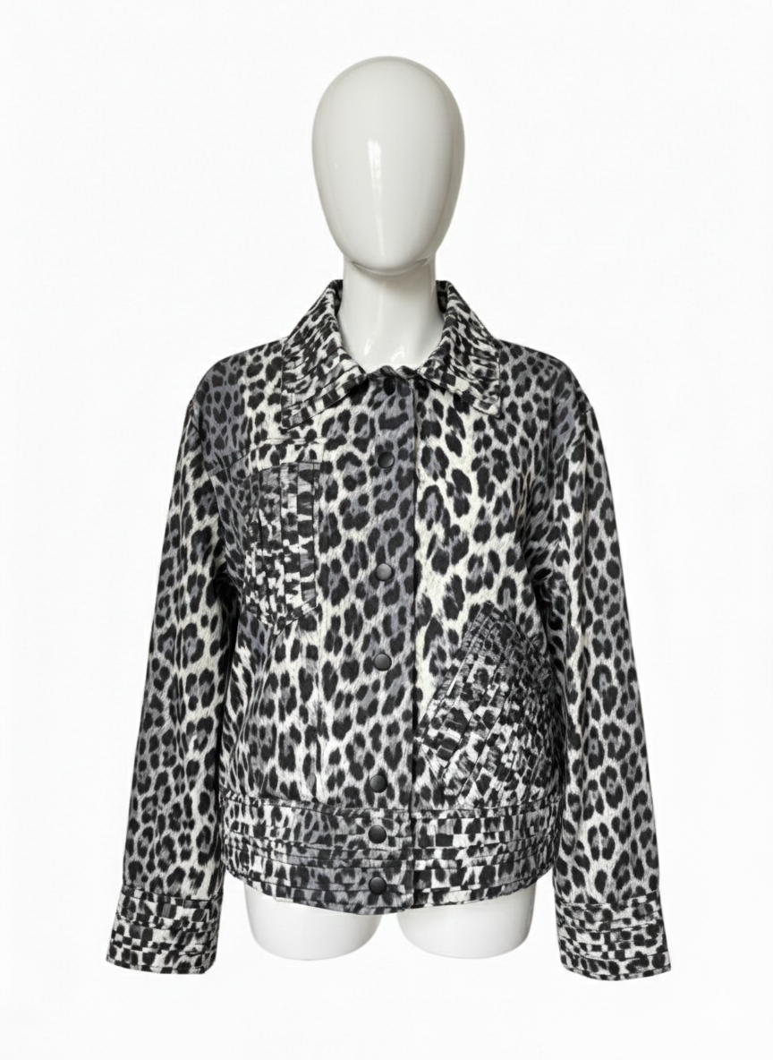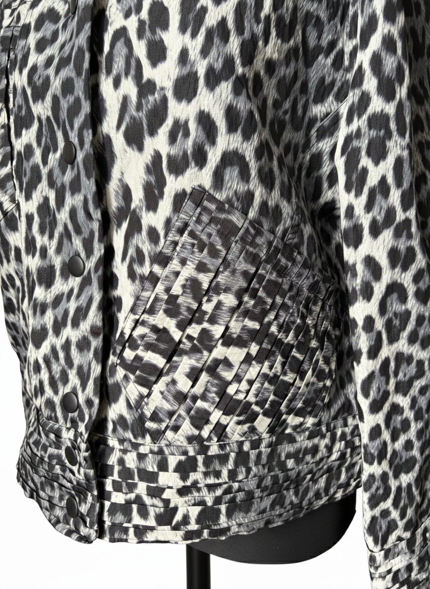 Origami features a sophisticated leopard print design with pleated layered sleeves and strategically designed pockets. This combination of style and practicality allows for enhanced movement while maintaining a polished appearance, making it suitable for various occasions. The pleating adds texture and dimension, promoting an elevated aesthetic.